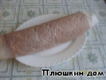 7. По истечении времени достаем корж, скручиваем в рулет вместе с бумагой и оставляем до полного остывания.