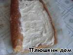13. Остывший рулет разворачиваем, пропитывем остальными сливками, смазываем творожным кремом и сворачиваем обратно.