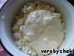 Смешать творог со сливками, солью, сахаром, яйцом и мукой.