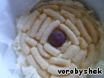 Разделить на 2 части. Одну часть выложить в форму, укрытую пергаментом. Сверху уложить кукурузные палочки и в середину - конфету.