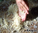 Рассыпаем манку по столу, сбрызгиваем соленой водой и перетираем руками, понемногу подсыпая муку.