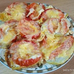 Теперь кладем сверху соус, затем разрезанные пополам кольца помидоров.