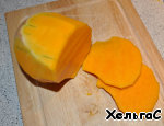 Пока коржи пекутся, займемся кремом. Сначала нарежем тыкву.
