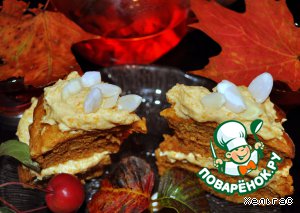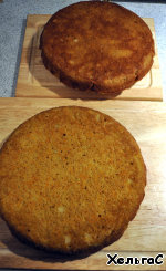 Наши коржи готовы - промажем их кремом и положим друг на друга. Верхушку украсим орехами, и в моём случае маленькими яблочками, сваренными в молоке с сахаром, опять обязательно коричневым.