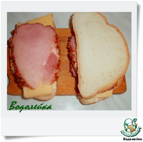 Сверху на сыр снова кусочек ветчины (фото слева) и прикрываем кусочком батона.