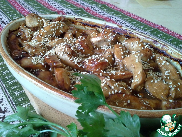 Хорошо полить соусом и отправить всё это в духовку, предварительно разогретую до 220 градусов, на 30 минут.
