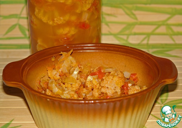Добрый вечер! Не зря я вас пытала (приношу извинения ) Вот, с результатом. У меня был кочан цветной капусты, 1,5 красных болгарских перца, 2 небольших стручка острого перца, немножко зеленого лука и пучок петрушки. Все остальное по рецепту, правда помидор пришлось взять в 2 раза больше. Результатом довольны очень-очень, даже муж (анти-фанат капусты) заценил, спасибо!