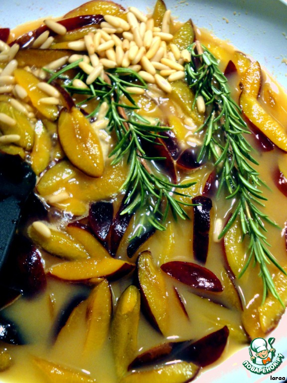 Добавить апельсиновый сок, розмарин и кедровые орехи. На медленном огне немного уварить.