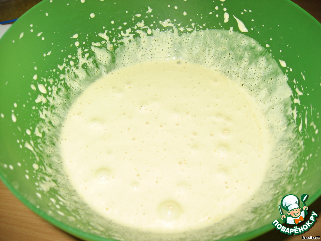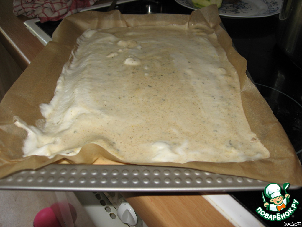 Половину белков вмешать в тесто, другую - аккуратно распределить сверху.