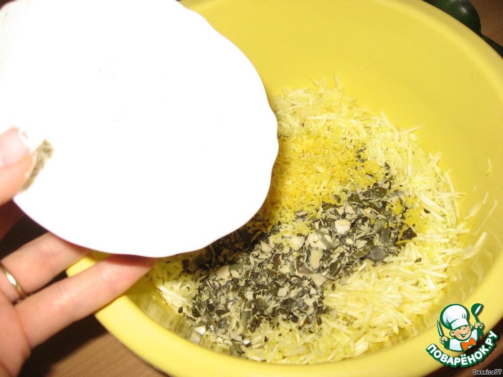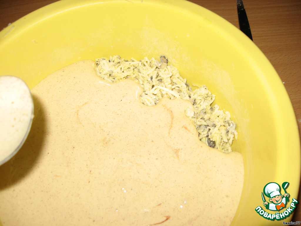 К цуккини добавить семечки, цедру и муку. Муку предварительно смешать с разрыхлителем. И все тщательно перемешать.