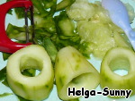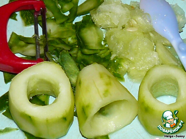 Чистые огурцы очистить от кожуры, нарезать на бочоночки и вынуть семена ложкой. -
