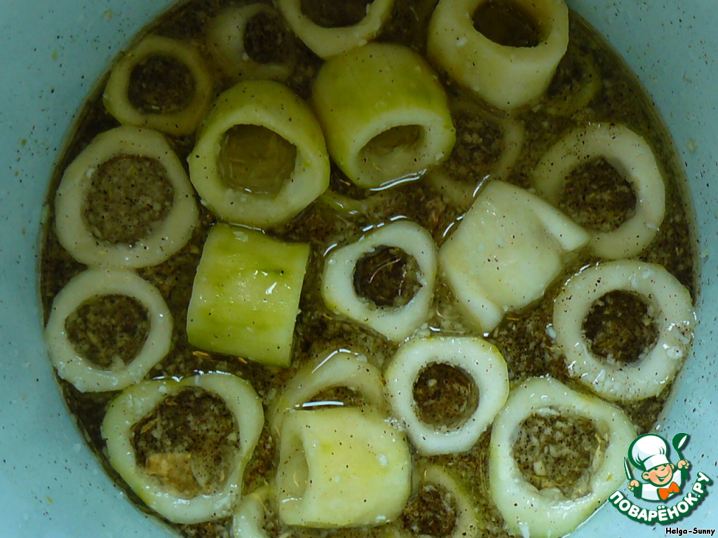 Смешать соль, сахар, перец, уксус, масло, чеснок и положить в этот маринад огуречные бочонки. Прикрыть крышкой и оставить на 12 часов пускать сок.