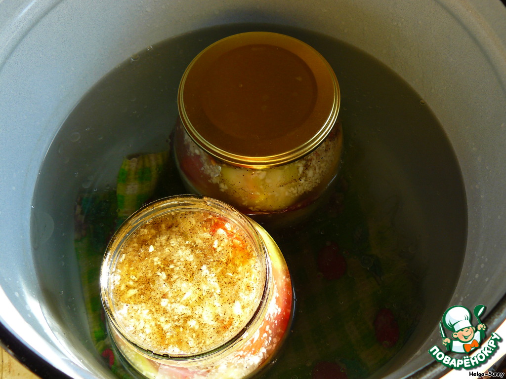 Залить жидкостью из-под огурцов и стерилизовать 10 минут. Закатать, перевернуть, укутать.