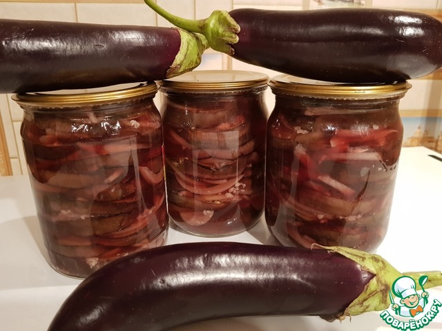 Ни разу за свою сознательную, довольно долгую закаточную практику не готовила баклажаны подобного способа консервирования . Захотелось попробовать! Готовится закрутка довольно быстро. Из 1/3 порции вышло 3 банки по 0,5л, а маринада вся норма. Ждем зимы. Думаю, будет вкусно!