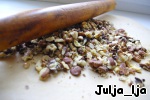 Займёмся начинкой. Для этого подготовим орехи. Если нужно, очистим и измельчим. Мне хотелось, чтобы орехи хорошо чувствовались, потому я просто немного подавила их скалкой.