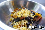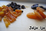 Курагу, чернослив и изюм, если нужно, заливаем кипятком и оставляем на несколько минут. Нужно это делать в том случае, если сухофрукты слишком сухие. Если нет, достаточно просто обдать кипятком. И нарезаем курагу и чернослив соломкой.