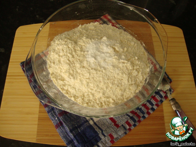 Растереть руками в крошку, добавить разрыхлитель теста и соль.