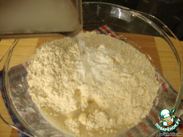 Понемногу влить воду, замесить мягкое тесто. Возможно, вам понадобится больше или меньше воду, это зависит от степени влажносту муки, поэтому вливайте воду постепенно, чтобы по ходу определить количество жидкости.