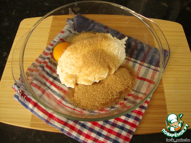 Для начинки размешать творог, коричневый сахар, яйцо.