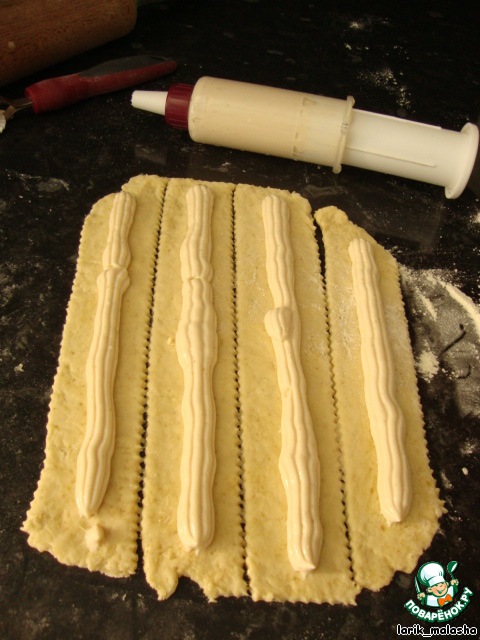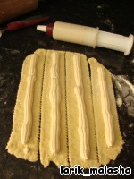 Тесто раскатать в тонкий пласт на столе, присыпанном мукой. Пласт должен быть длиной около 25 см, но это на ваше усмотрение. Вырезать плоски шириной примерно 5 см.