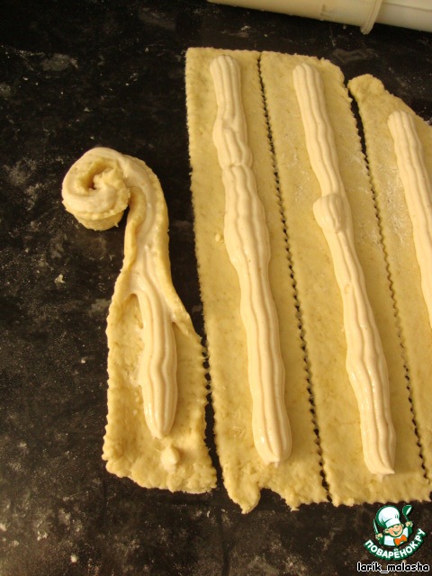 Выложить творожный крем в кондитерский шприц и выдавить его на середину полоски.