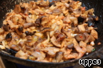Отваренные (минут 20) грибы не крупно нарезать, обжарить минут 10. Добавить кубиками нарезанный лук, кетчуп, соль, молотую красную паприку и жарить еще минут 5. Туда же петрушку, перемешиваем и отставляем в сторону (остудиться)
