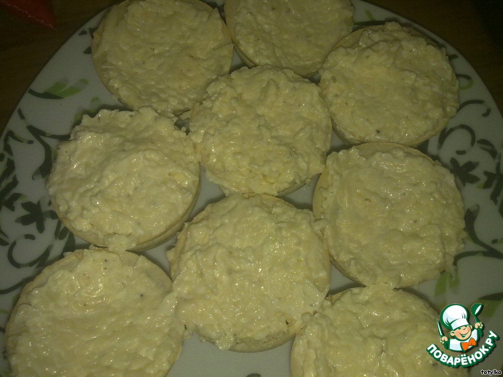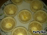 В готовые вафельные тарталетки на дно наливаем предварительно подогретый в микроволновке (20 сек.) либо на паровой бане жидкий плавленный сыр.
