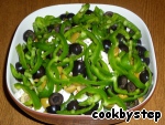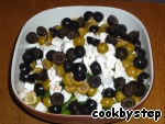 С черных и зеленых оливок слить лишнюю жидкость. Порезать на половинки, колечками или вообще оставить целыми на ваше усмотрение (у меня половинки). Отправить смесь оливок и маслин в салат.