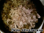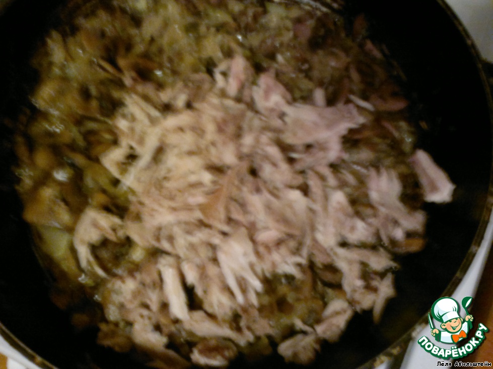 Добавляем отварное, измельченное куриное мясо, жарим 2-3-минутки.