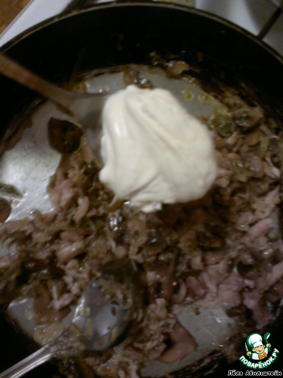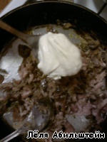 Далее добавляем сметану, хорошо все перемешиваем и снимаем с огня.