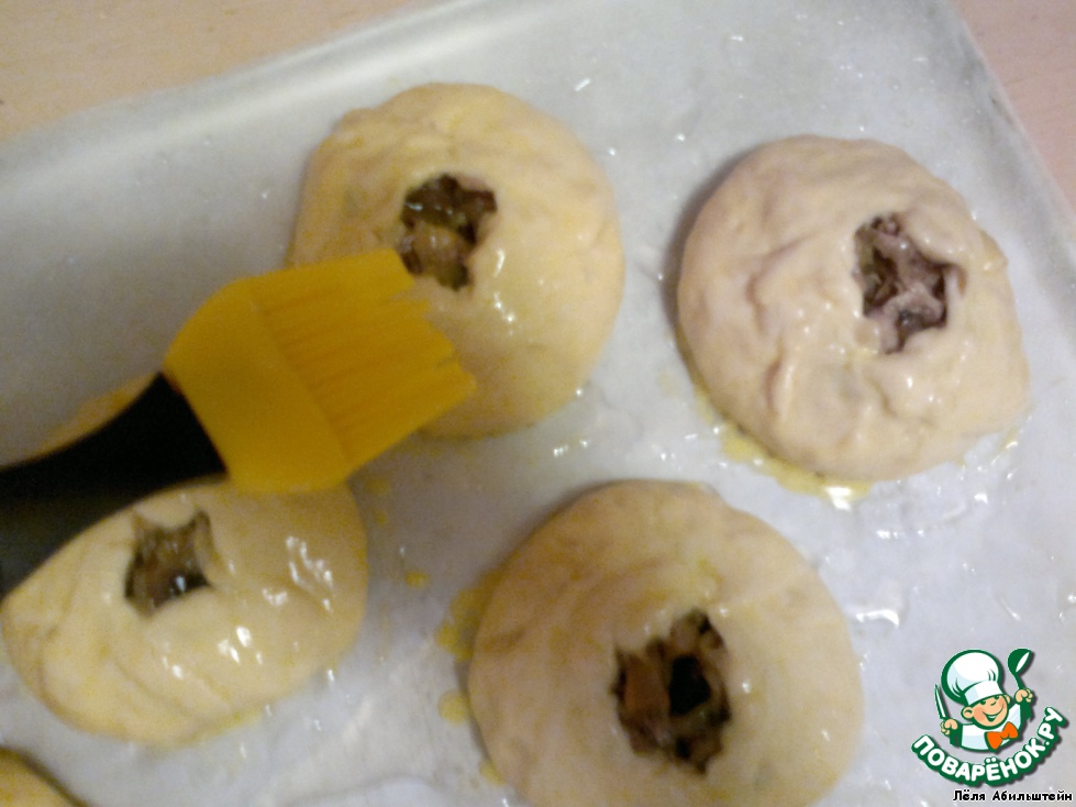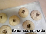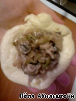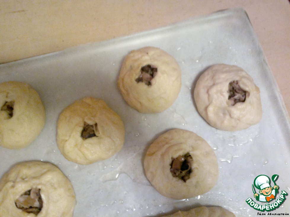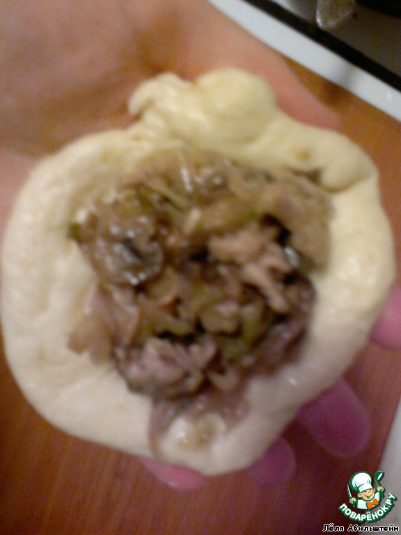 Формируем из него руками шарики, разминаем их, в середину кладем столовую ложку начинки и защипываем, оставляя сверху маленькую дырочку.