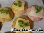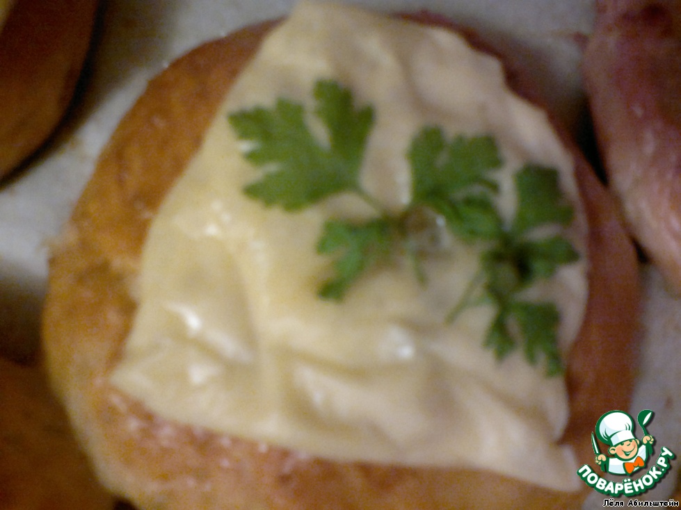 Когда "гнездышки" зазолотятся, вынимаем их из духовки. Кладем на каждое по тонкой пластинке сыра и по нескольку листиков петрушки. Опять помещаем в духовку минут на 5-10 до того момента, когда начнет пузыриться сыр.