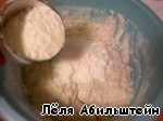 Затем постепенно всыпаем муку, сначала размешивая веничком, затем - руками.