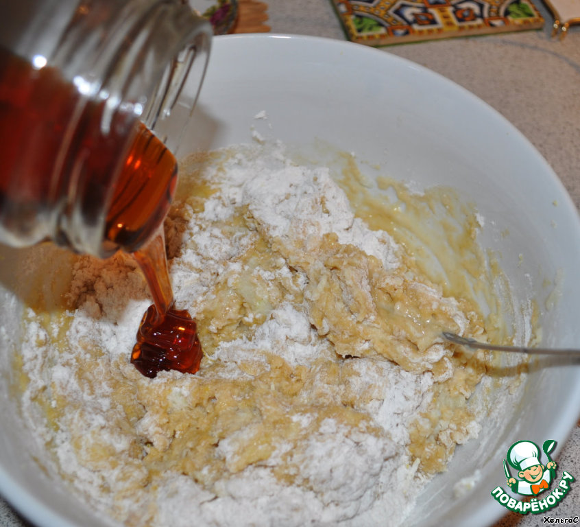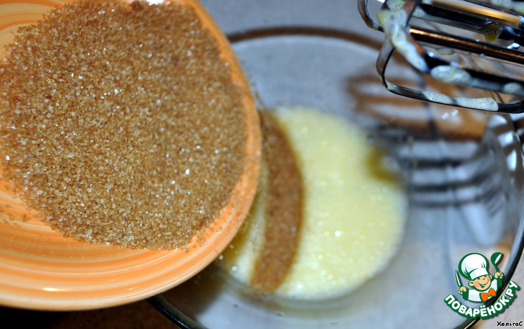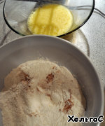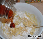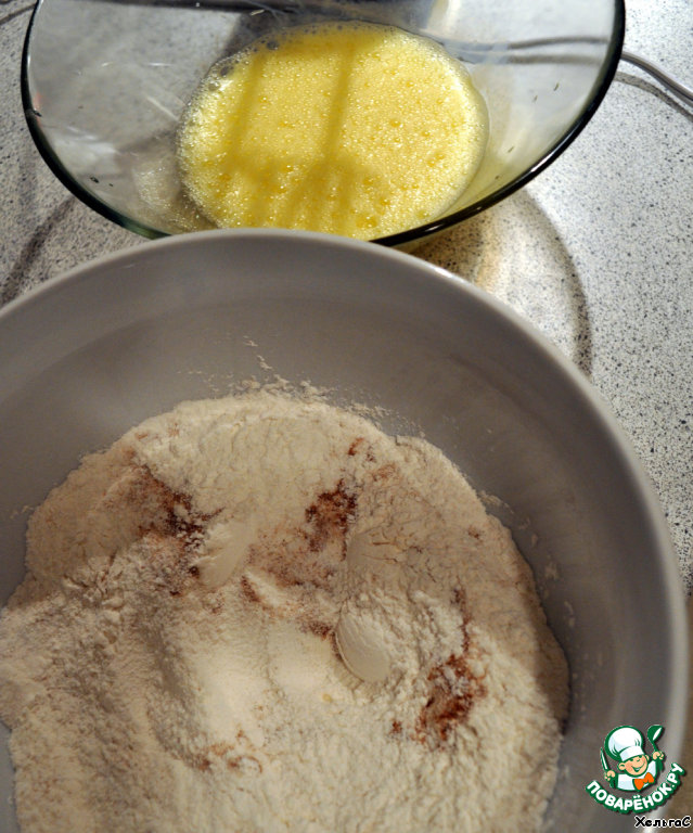 Как обычно, в двух посудах смешаем: в одной муку, разрыхлитель и специи для теста, а в другой яйца