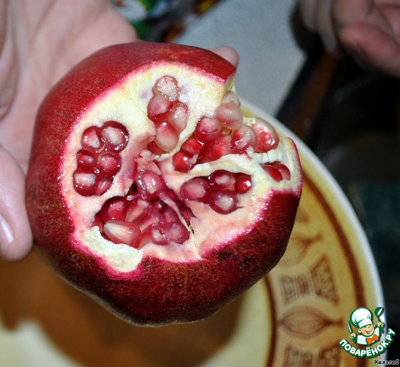 Вот какой красавец получился. Украсим и присыплем гранатовыми зернышками и молотым миндалём и подаём!