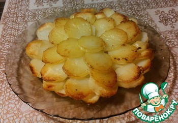 Можно использовать отдельные формочки или одну большую форму. Смазать хорошенько сливочным маслом. И выложить картофель таким образом: в центр выложить пластинку картофеля, следующие пластинки выкладывать внахлест, как лепестки цветка.