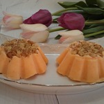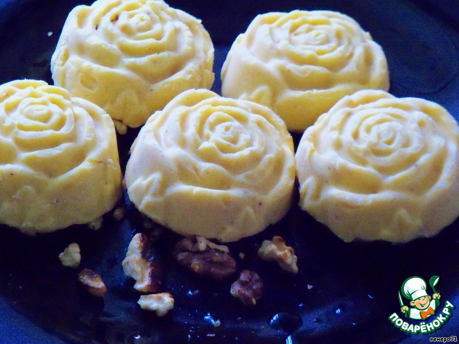 • Я использовала силиконовые формочки, на дно каждой уложить орехи. Достать смесь из морозилки и слегка взбить, я взбивала вилкой, боялась сливки перебить, масса должна стать слегка воздушной и плотнее по консистенции, можно и миксером, но на минимальной скорости.