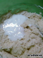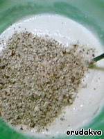 Теперь в кекс можно добавить всё, что подскажет фантазия: изюм, орехи, цукаты, мак, какао или кофе, корицу или ваниль. У меня были орехи. Перемешиваем.