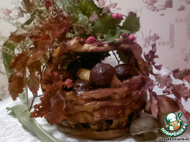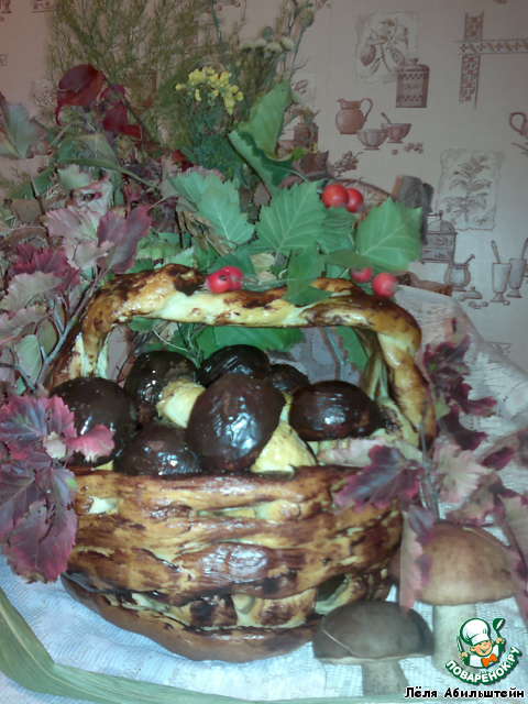 Осень... Когда я обдумывала идею этого блюда, на память пришла деревенская осень. Вы любите собирать грибы? Я - просто обожаю. У бабушки в деревне есть лес, а в нем - заветная тропинка. Это место в лесу называется "Белый столбик". Там, на разветвлении дорожек, и правда стоит белый столбик уже много десятилетий. Когда я была маленькой, мы с папой ездили осенью в лес к этому самому белому столбику, и на нашей заветной тропинке (о ней никто не знал) всегда находили благородные грибы - белые, подосиновики, подберезовики... Даже если год был не грибной, наша волшебная лесная тропинка всегда нас выручала. Дарю Вам корзиночку с осенними грибами из нашего леса!