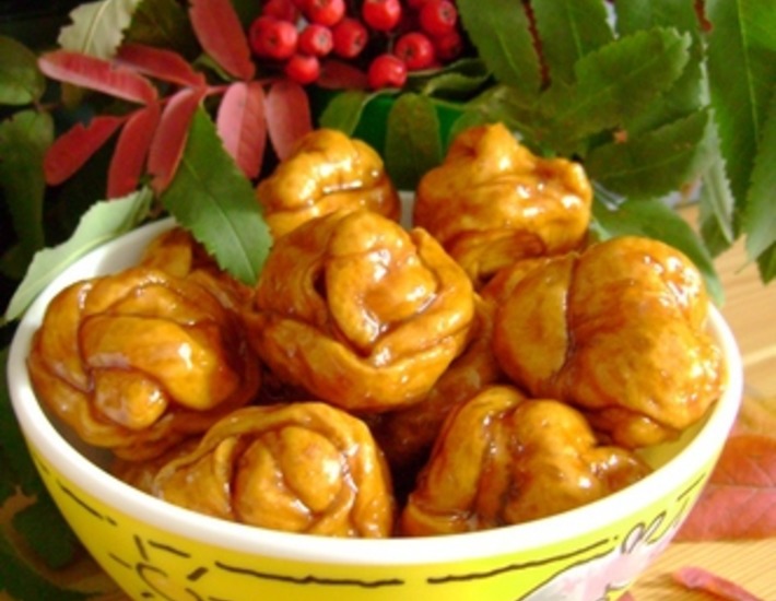 Каричневый сахар растворить в горячей воде, добавить меда, довести до кипения. В кипящий сироп положить "клубочки". Закрыть крышкой с отверстием (или поставить зубочистку для выхода пара). Варить на медленном огне 50-60 мин. Готовые клубочки приобретут коричневый цвет. "Клубочки" выложить на смоченную водой доску или противень. Переложить в блюдо для подачи, можно посыпать сахарной пудрой для красоты.