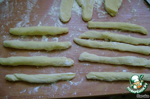 На стол насыпать 1-2 ст.ложки муки, выложить тесто, вымесить. Тесто должно быть "гибким", чтобы можно было из него скатать "веревочки" (диаметром 1/2-1 см, длиной 12-15 см).