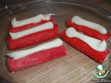 • На каждую палочку положить немного майонеза (вдоль). Удобнее всего это делать, если пачка майонеза с закручивающейся крышечкой.