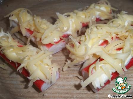 • Натертый на крупное терке сыр посыпать на палочки поверх майонеза. Если сыр лень натирать, можно просто тонкие кусочки сыра положить!)))