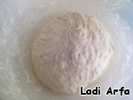 Вымешиваем тесто до состояния слегка липнущего к рукам, но собирающегося в колобок. Слегка смазываем маслом, закрываем и оставляем для подъёма в объёме в 2 раза.