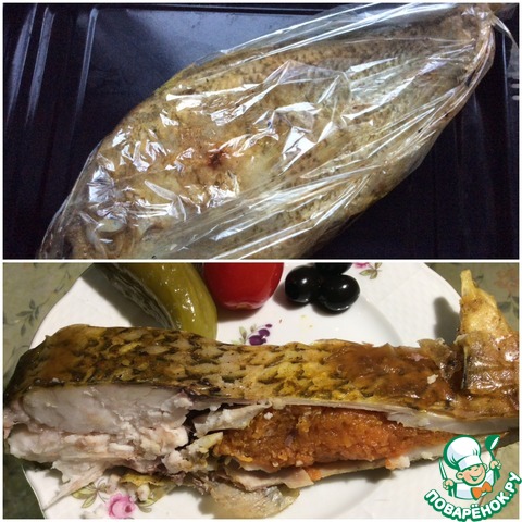 Готовить в духовке на среднем огне где-то 40 мин., затем рукав аккуратно разрезать и снова убрать в духовку до зарумянивания, периодически поливая выделившимся соком, жидкость должна почти полностью испариться. Все! К сожалению, рыбу целиком мне заснять не удалось, а вот кусочек есть. -