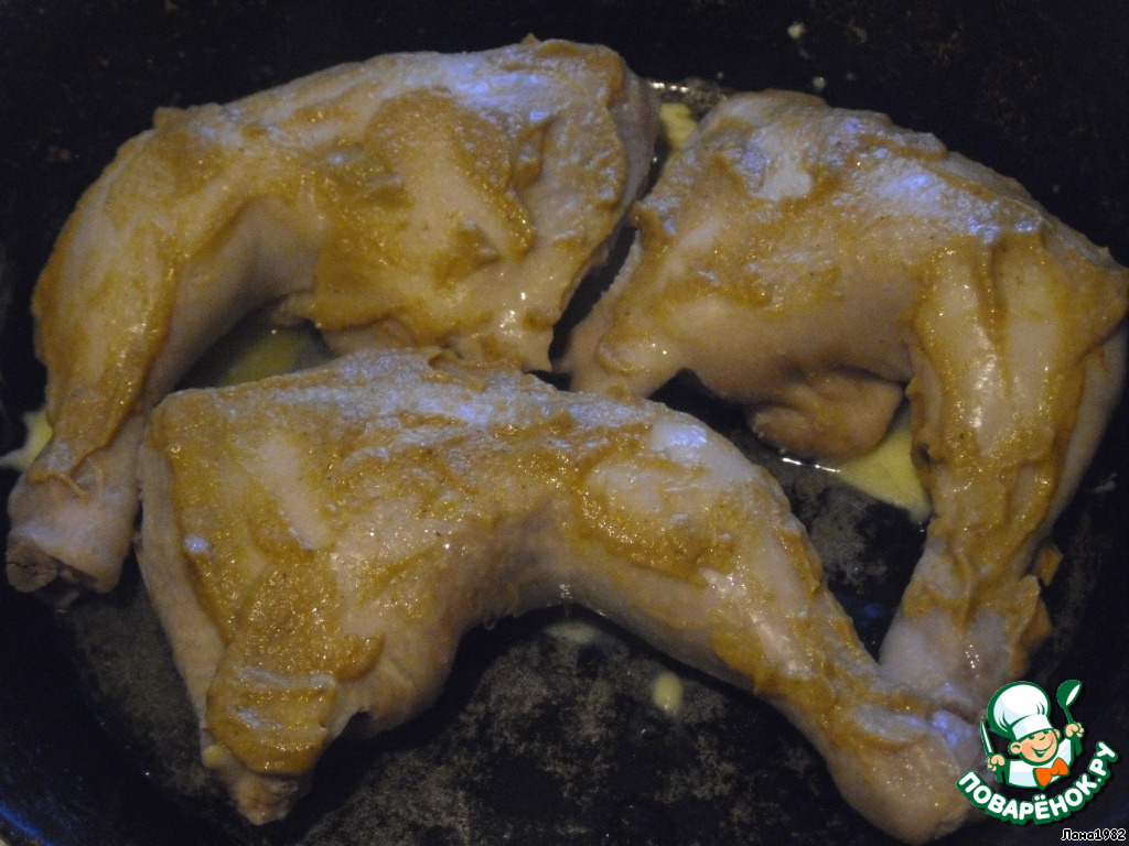 Готовую курочку поперчить, посолить, смазать сливочным маслом и горчицей.