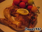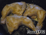 Положить курочку в сковороду, добавить сок лимона, влить пиво. И выпекать в духовке при T=180*C 30 минут.