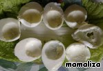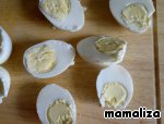 Яйца отварить, охладить, очистить, разрезать на половинки.