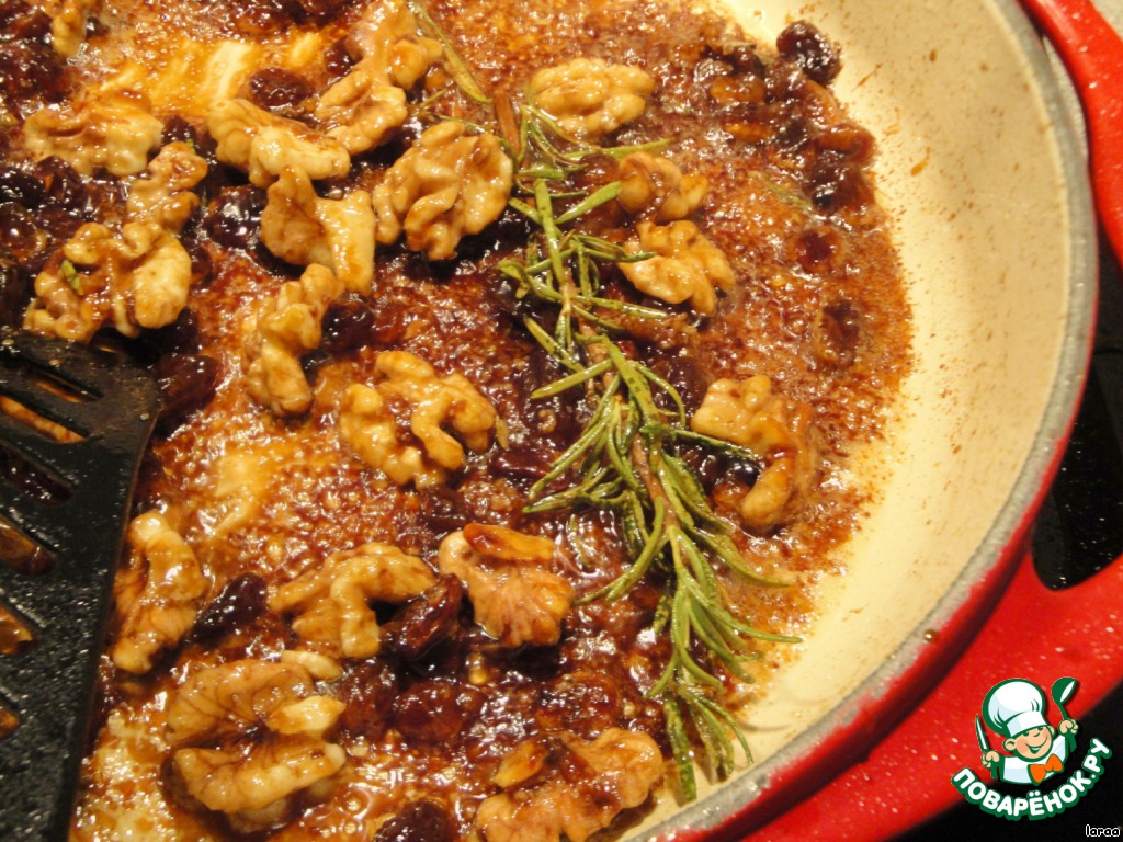 Когда сахар полностью растает, добавить орехи и выложить изюм с бальзамико.