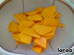 Тыкву нарезать на кусочки толщиной 0,5 см. Бланшировать. Выложить на сито и обсушить.